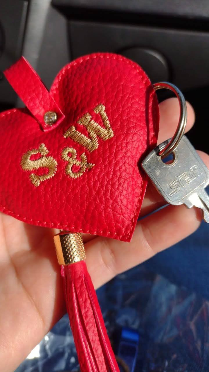 Ele tem um coração com a sua inicial, e um tassel da mesma cor.