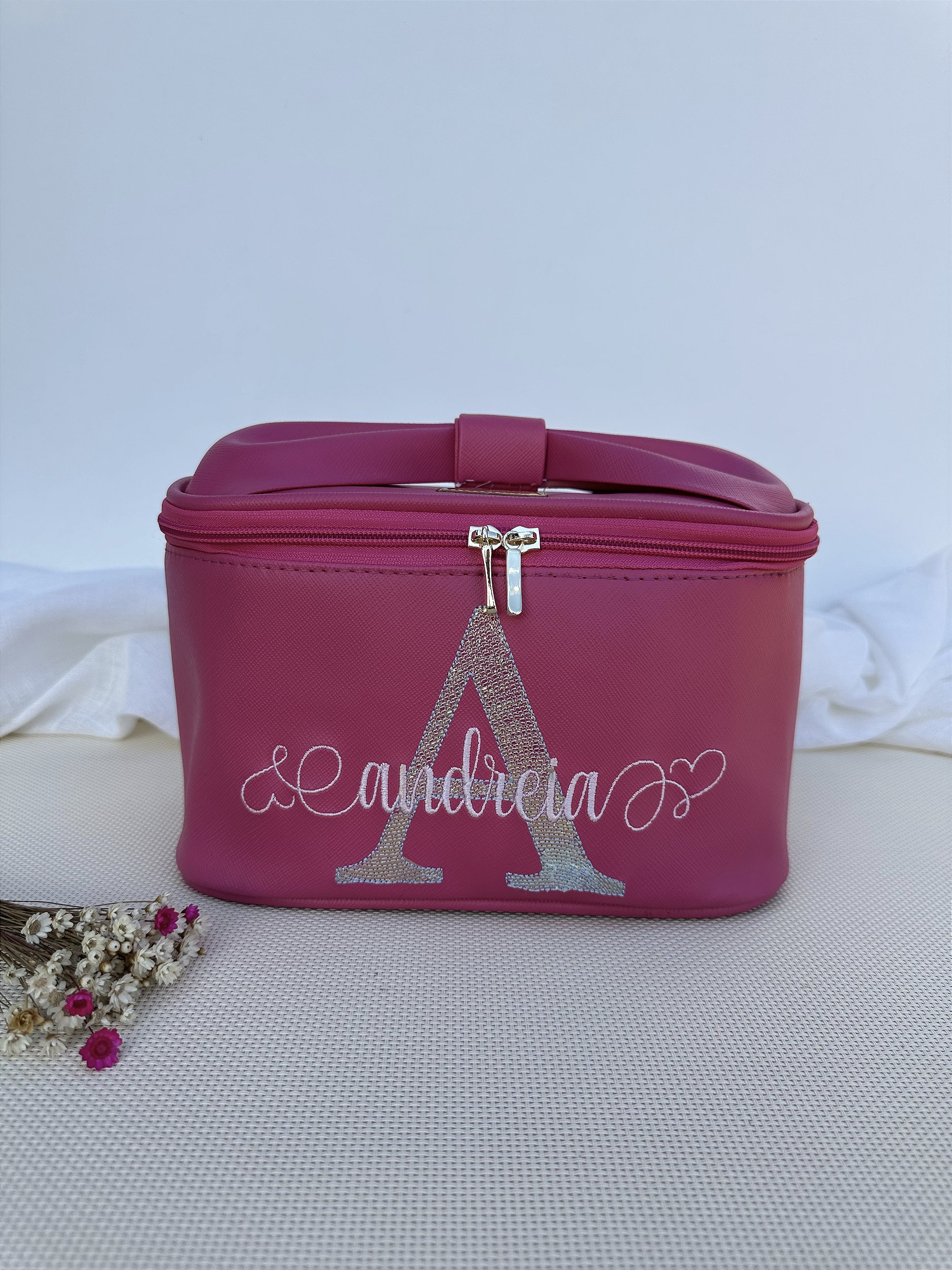 Com um bolso interno na tampa pra colocar espatula alicate etc. E vários elásticos nas laterais internas para prender os frascos de esmaltes.